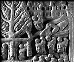 飛天は、このエジプト風のハス模様が流行遅れにならない時期、そして仏陀がまだ人の姿ではなく、ストウーパや車輪や菩提樹の茂みで象徴的に表されていた頃に現れてくる。図10はサーンチー大塔を囲む門と石垣にほどこされた浮彫の一部で、この中には仏陀を現す塔の左右に花輪をささげた、鳥とも人ともつかない翼を持った生き物の姿が見える。これは飛天というよりカリョウビンガとかカルラという天上に住む鳥の仲間なのかも知れないが、インドの仏教美術の次の段階に人の姿で刻まれた仏陀の上空左右に仕えることになる天人と全く同じ役割を担っている。そして図11のバールフトの菩提樹の両側には、飛天そのものが彫られている。