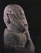 This stone carving was used as a fountain in an Asuka Period garden. It was designed so that water could rise through a hole at the bottom and dis-charge from both the mouth of the female and from a stemmed drinking cup held up to the mouth of the male. Today the lower part of the cup is missing and one sees the branched cavity through which water once flowed. The facial characteristics attract notice for their exotic cast. The carving was unearthed in 1903 from the neighbor-hood known as Ishigami, 600 meters to the southwest of the present museum. Since the 1930's, it has also been familiarly referred to by the term dosojin (a name also applied to phallic-shaped stones associated with folk religion and certain Shinto shrines).