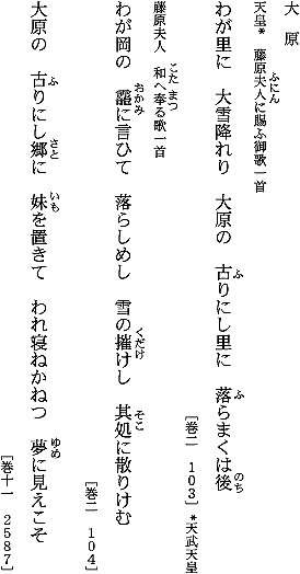 Composed by Emperor Tenmu and presented to Lady Fujiwara (one of his consorts) At my place A great snowfall there has been But at your dilapidated old village at Ohara Later it will fall, if any Man'yoshu I 03