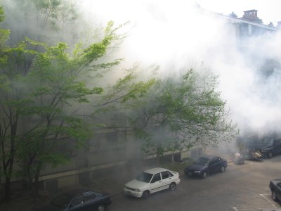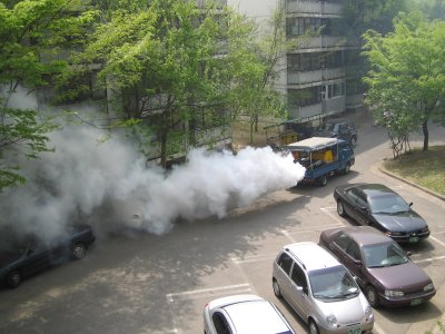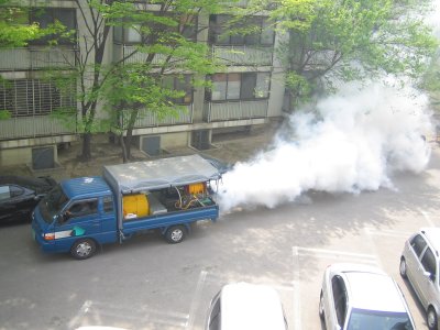 もうすぐ夏です。その前に町中消毒しまくります。このおかげで道にはゴキブリもいない!アジョシが機械でまいたり、バイクに乗ってまいたり。今回は車に乗ってまいてました。
