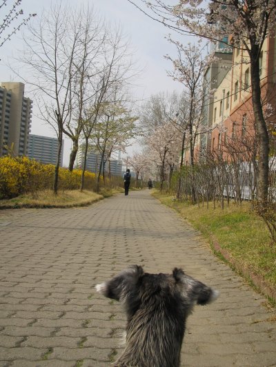 シンと散歩に出て、家の前で旦那が来るのを待ってた。旦那はガスの点検をしに来たアジュンマを応対してたので、私達だけ先に出て待ってたの。旦那が出てきた途端にシンは猛ダッシュ。ヒモを引こうとして足を踏ん張ろうとしたら、足下の土管に引っかって踏ん張れず、結果手もヒモが引っかかって放せずに、シンに引っ張られ、手もつけずに顔面からコンクリートにぶち当たった。旦那を待ってる間に一緒に遊んでた友達のアロンイのおばちゃんが急いで応急手当をしてくれたけど、私は呆然。去年末に買ったばかりの30万ウォンの眼鏡は吹っ飛んでいくし、頬は痛いし・・・・。涙出そうでした。