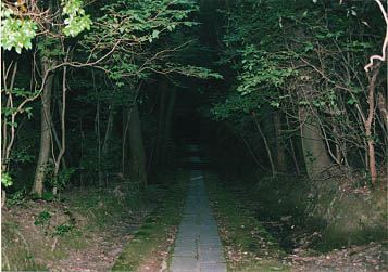 目前に広がる異界。石畳の道の両側は苔むした森。ちょっぴり「もののけ姫」気分です。 |