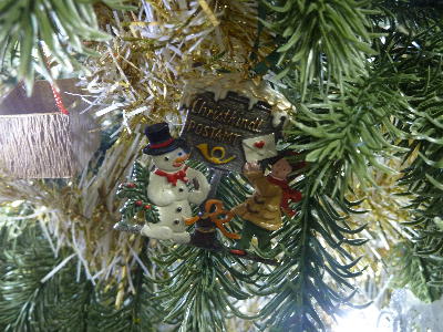 飾ってあるのは、右上のようなレースで出来たくるみ割り人形や星、ベルなどと、左上のようなドイツ製の鉛のオーナメント、それに木製の魔女...これもドイツ製。 |